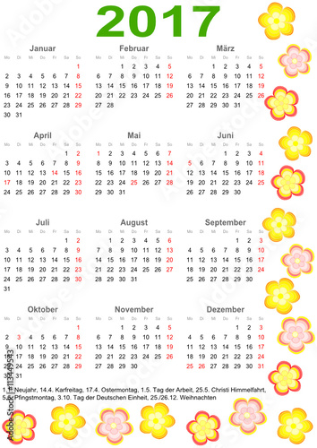 The vector illustration "Kalender 2017 für Deutschland mit Markierung und Auflistung der gesetzlichen Feiertage umrandet mit bunten Blumen" from mkabeck is available on Fotolia under a royalty-free license from 1 credit (Credit from 0.74 €).